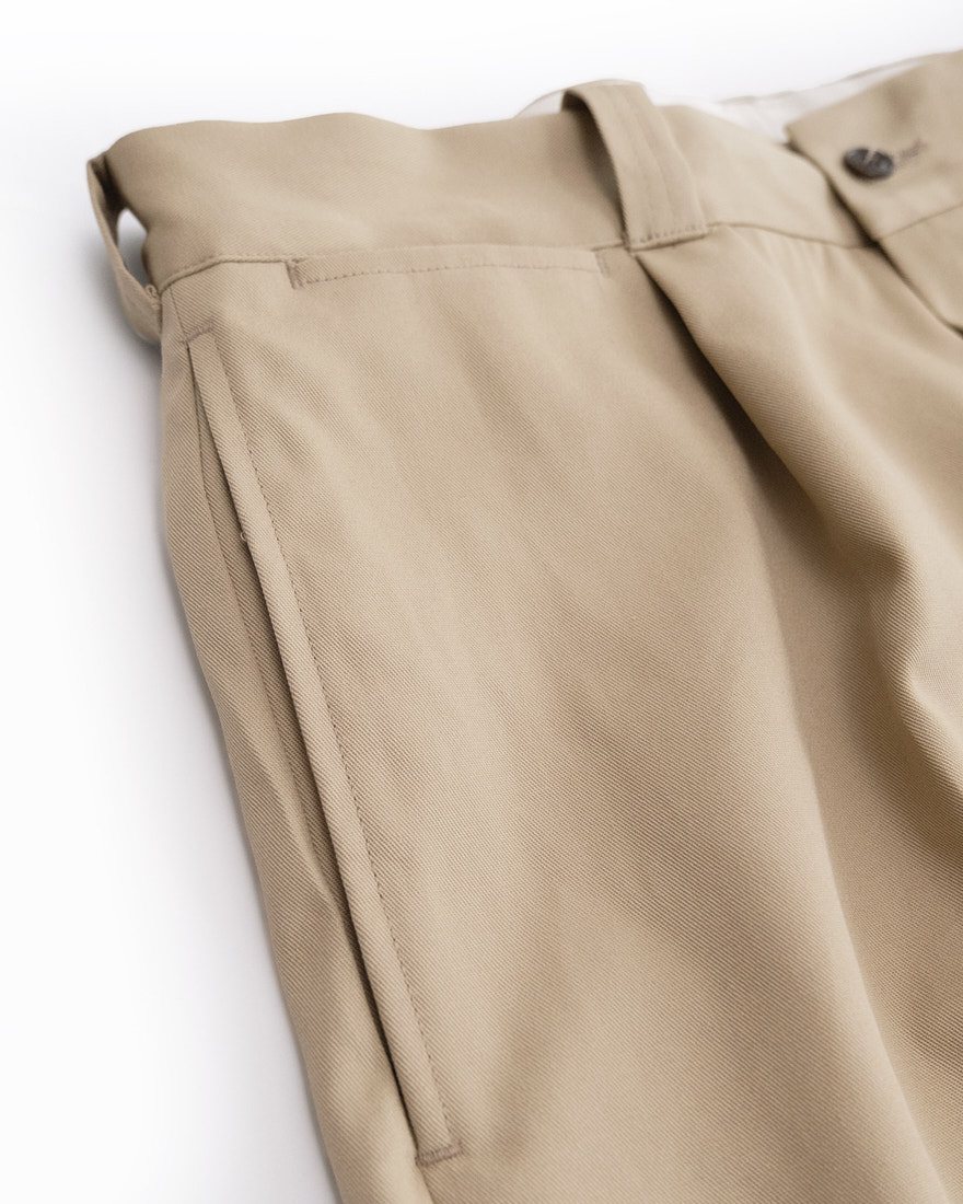 25AWの「FAT TROUSERS」から生地をアップデート。 新たに採用した綿ポリエステル生地は、綿100%では表現できない豊かな表情と、ポリエステル特有の機能性を兼ね備えています。汗ばむ季節でもべたつかず、さらりと快適な穿き心地。上品な質感でありながら洗い込むほどにヴィンテージのような風合いが増し、日常に自然と馴染む一本に仕上がりました。